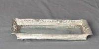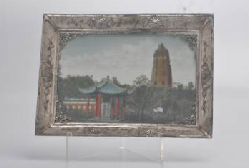 近代银丝边框玻璃底画屏果盘